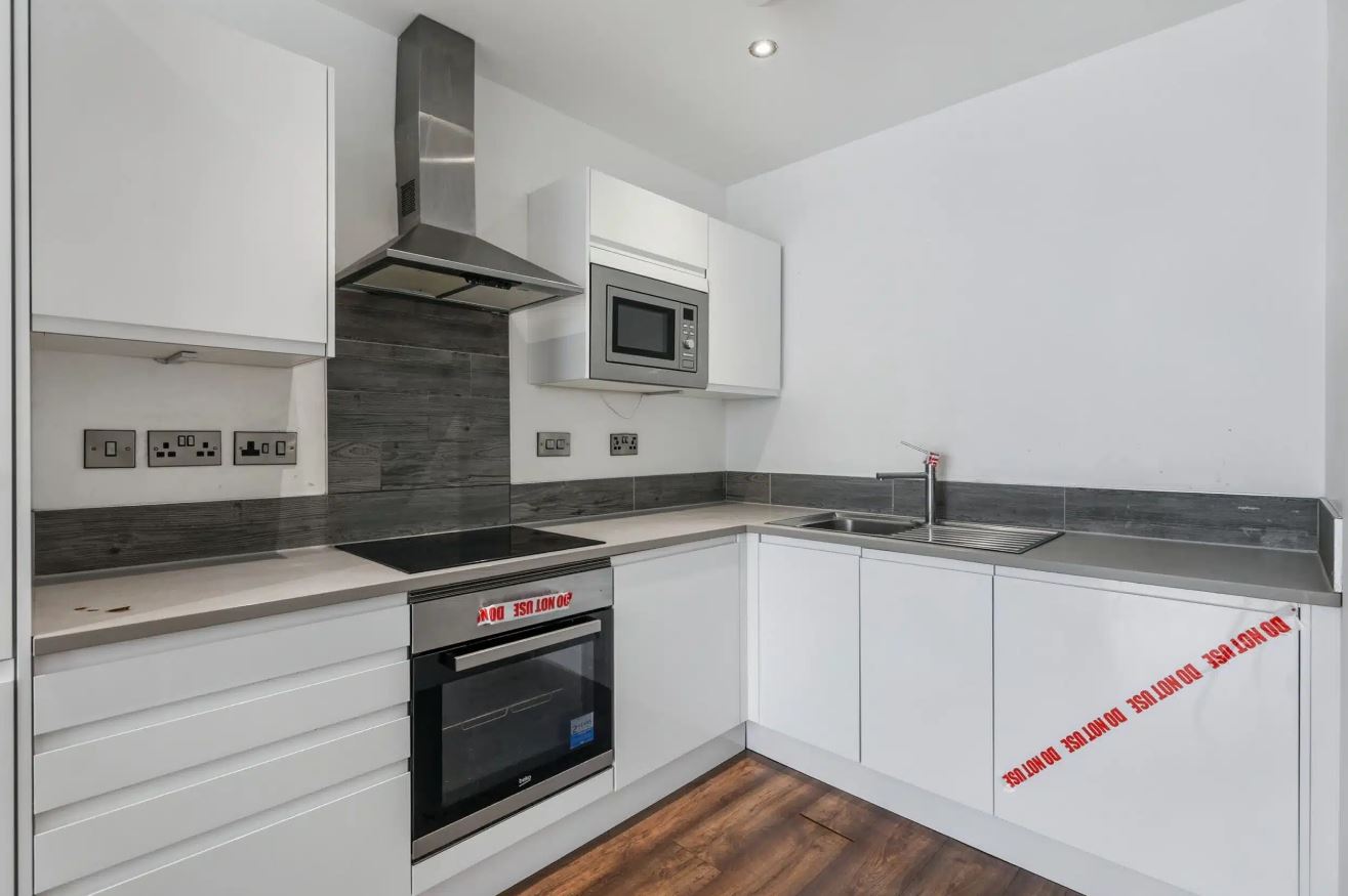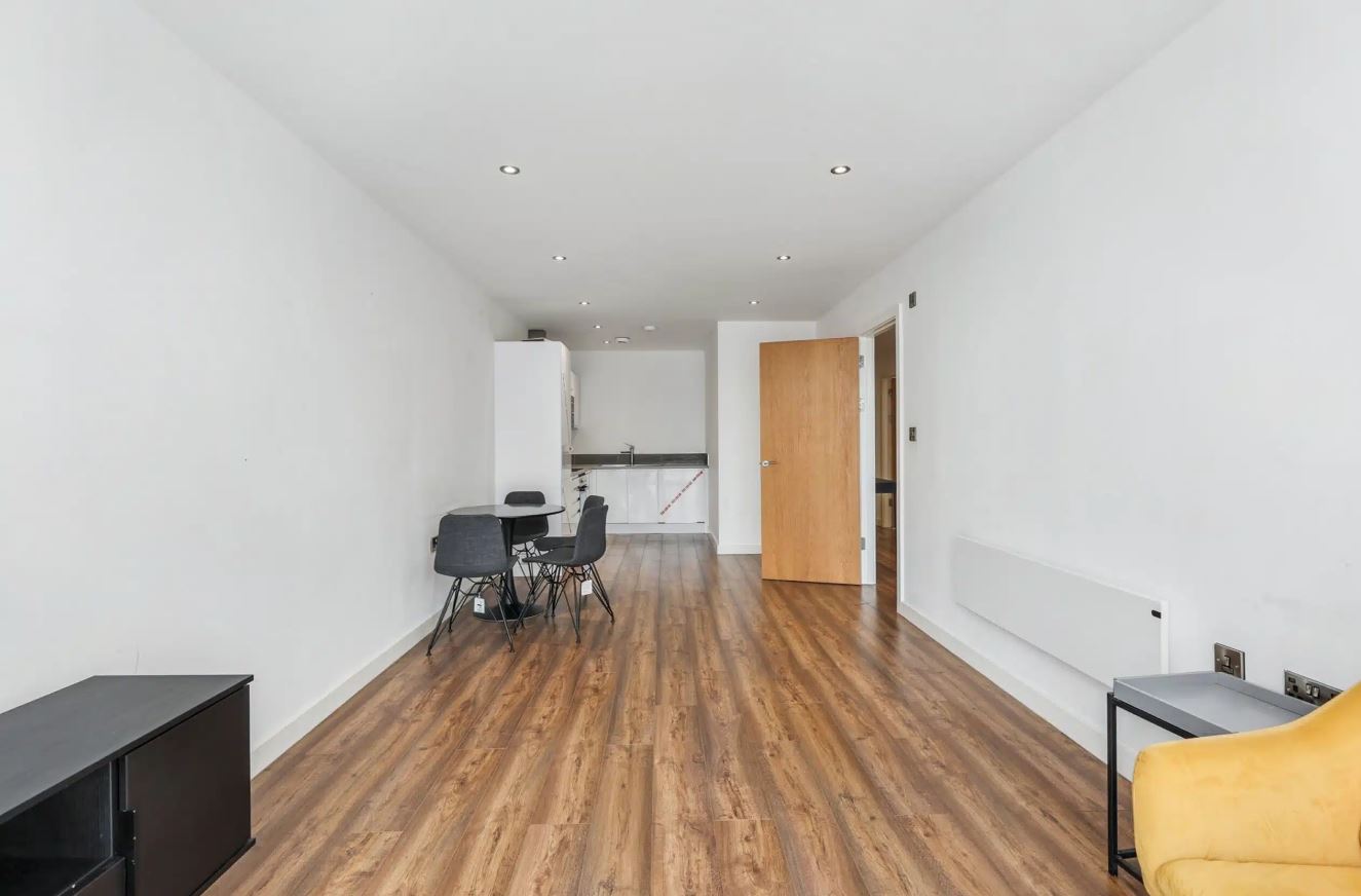 This stylish two-bedroom apartment offers bright, contemporary living in a modern development close to Manchester city centre. The open-plan living area features sleek wood-effect flooring and large floor-to-ceiling windows that flood the space with natural light, creating a warm and inviting atmosphere.